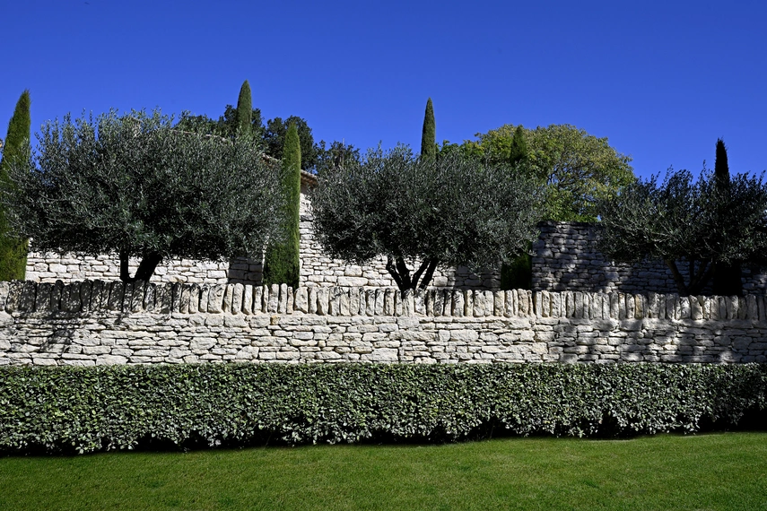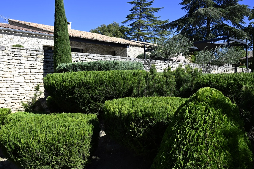 Two large cedars and numerous Florence cypresses dominate the house. A field of olive and pine trees spreads out before your eyes. Plants shaped like globes and wooden sculptures punctuate the garden.
