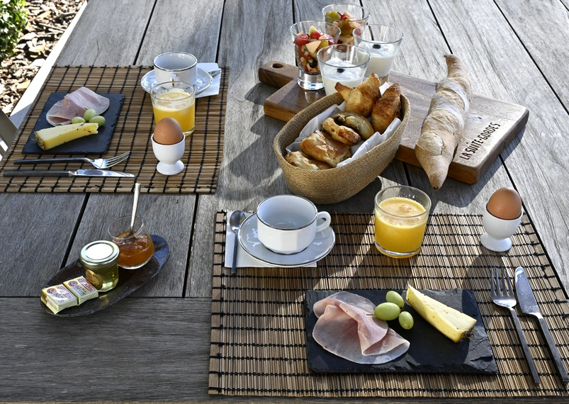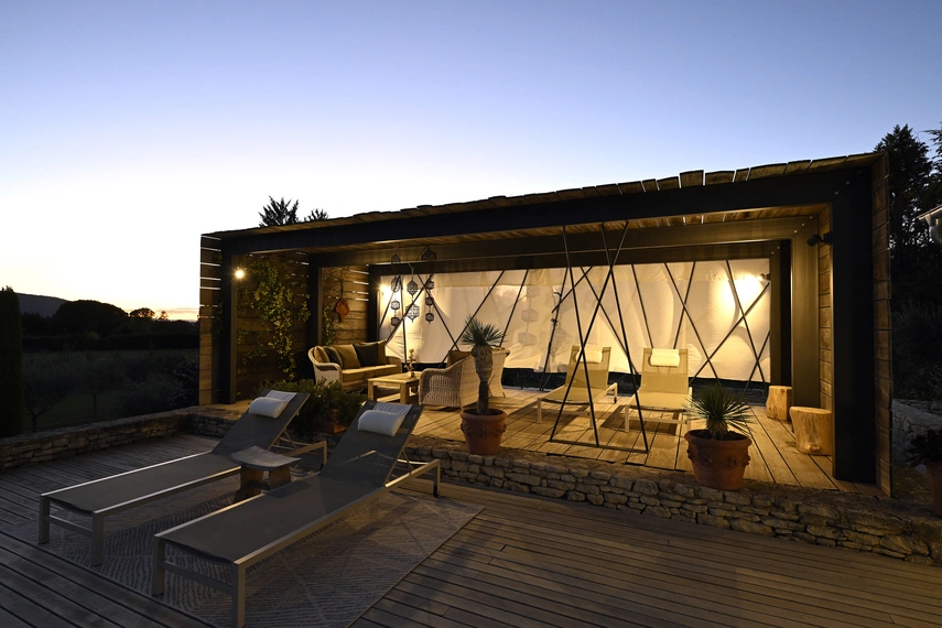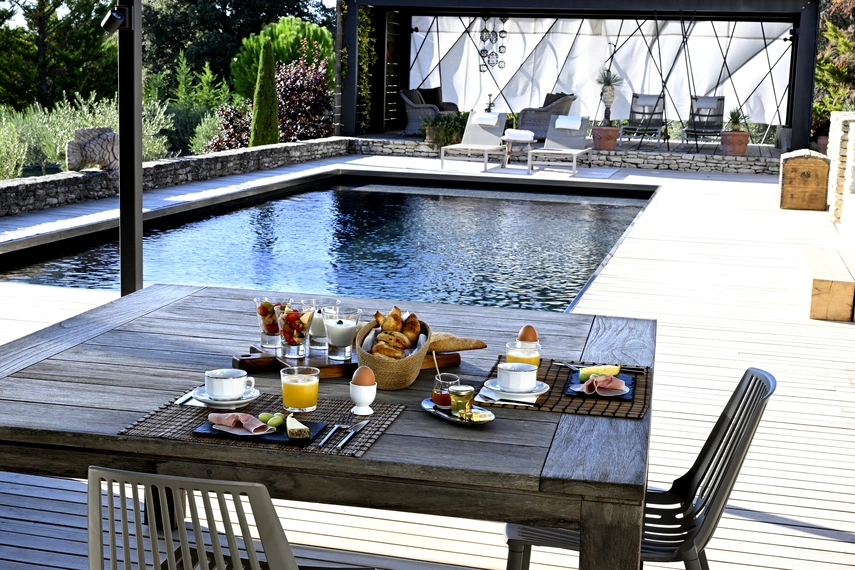 You'll be able to enjoy different areas of shade and rest around the pool, depending on how far the sun advances until it sets. An open wooden hut and large stretched canvas canopies house sofas, daybeds and soft couches from which you can enjoy the magnificent view of the Luberon, and enjoy your breakfast prepared by us with fresh, local and seasonal products.